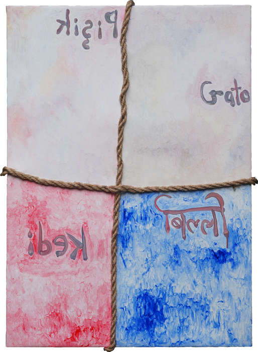 acrylic on canvas, panel, rope around 104×77cm